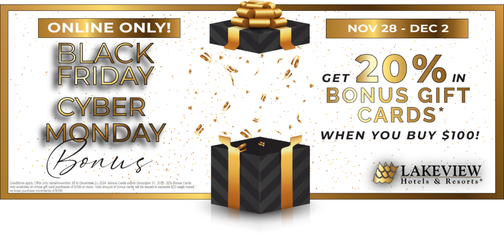 November 28 – December 1, 2025 Get a $20 bonus gift card when you buy $100! All Lakeview Gift cards are accepted at any of the following establishments: The Black Friday and Cyber Monday Bonus offer is only available from November 28, 2025 – December 1, 2025, and bonus cards will expire on December […]